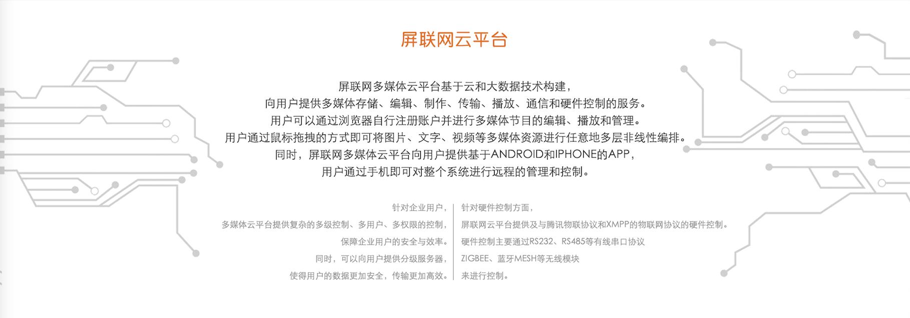 同一个平台,实现用户与设备、设备与设备之间的互联互通,实现更具个性化、更多功能化的信息发布,实现设备的互联网化的智能管理。